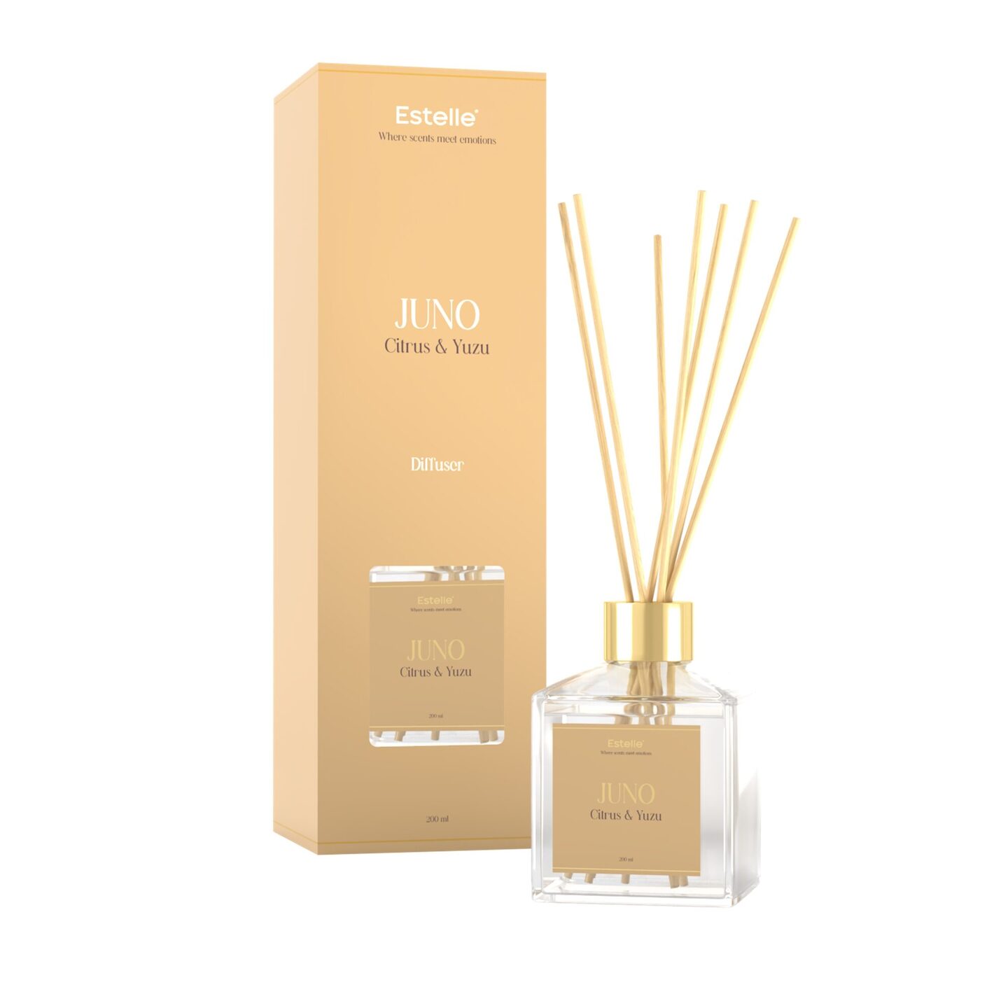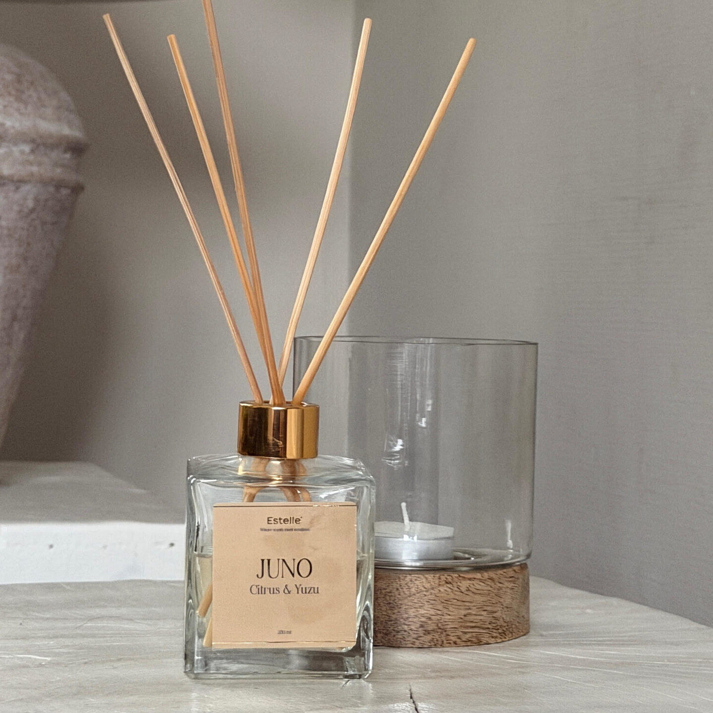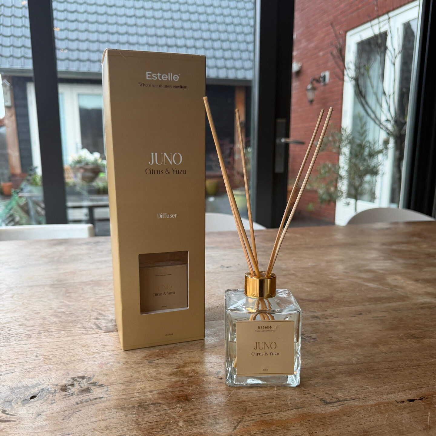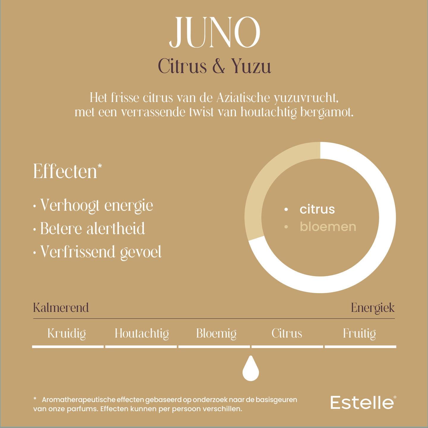 Juno Citrus & Yuzu van Estelle; het frisse citrus van de Aziatische yuzuvrucht, met een verrassende twist van houtachtig bergamot. Naast het verfrissende effect, verhoogt de geur ook je energie en alertheid.