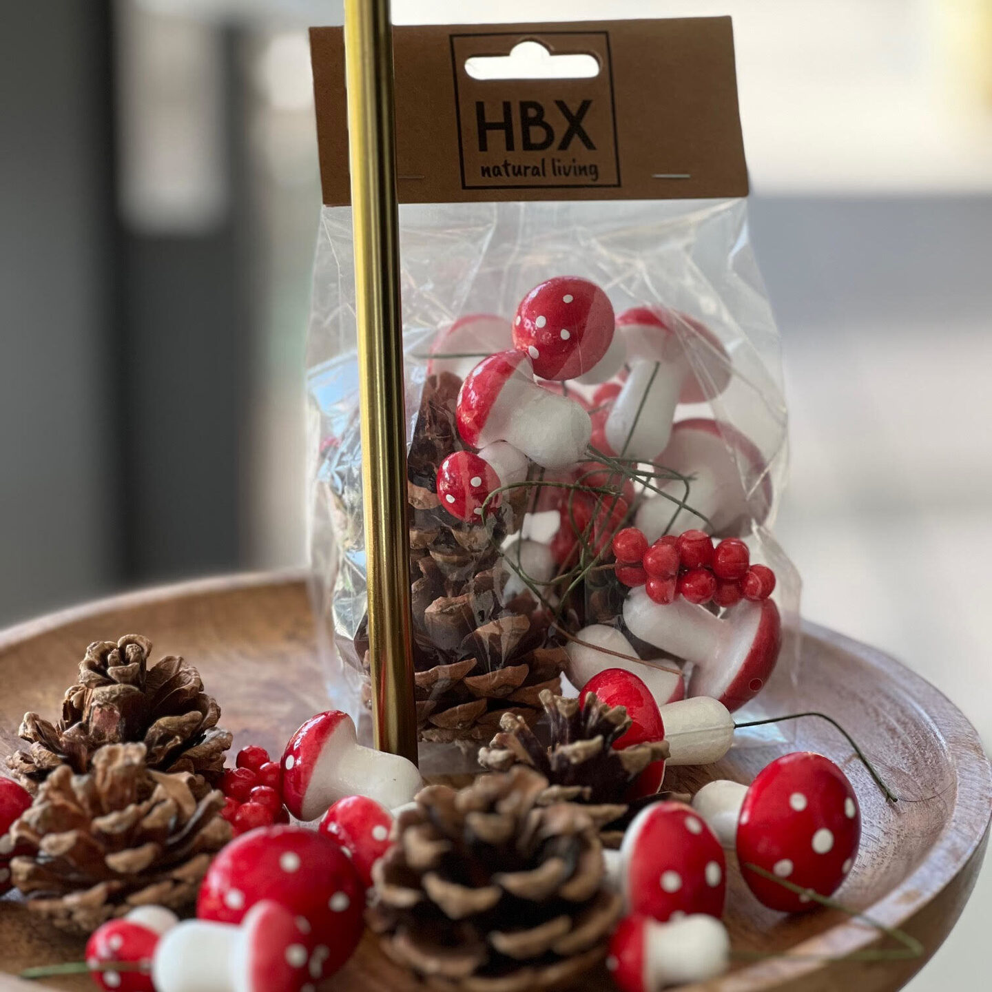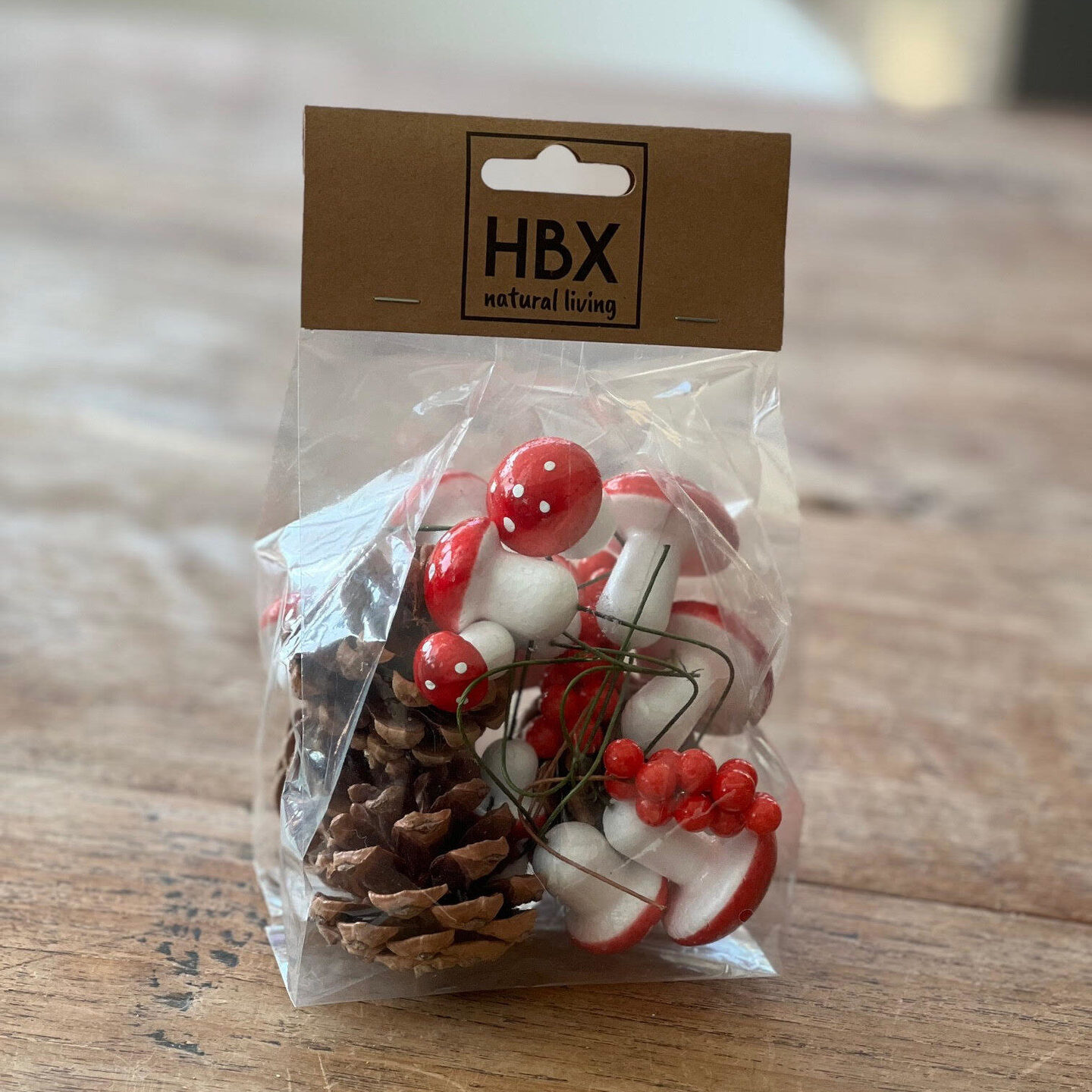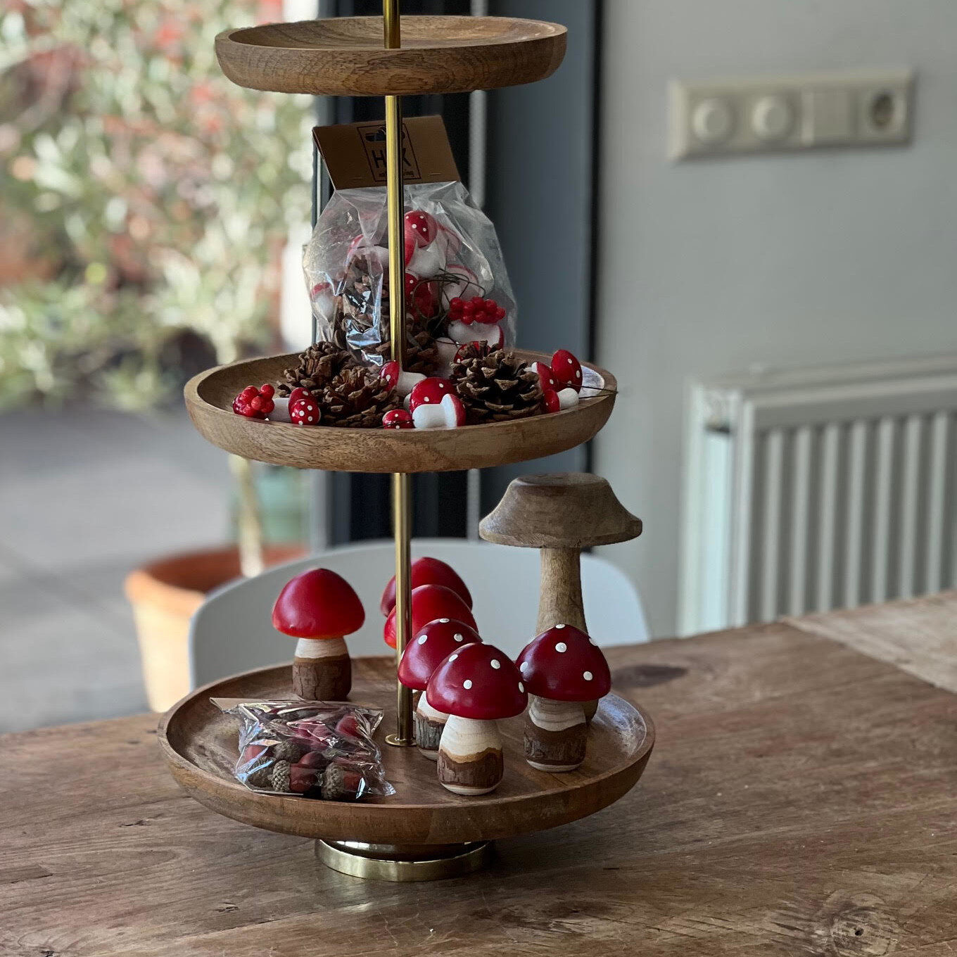Deze decoratie bestaat uit 4 dennenappels, 4 grote, 4 medium en 4 kleine paddenstoelen met stip en 2 keer rode bes. Het wordt als geheel door elkaar geleverd in een zakje. Je kunt de decoratie gebruiken om bijvoorbeeld je herfstkrans of bloemstuk te pimpen maar ik gebruik het ook vaak om een gedekte tafel of in mijn geval een gevulde etagère mee te versieren.