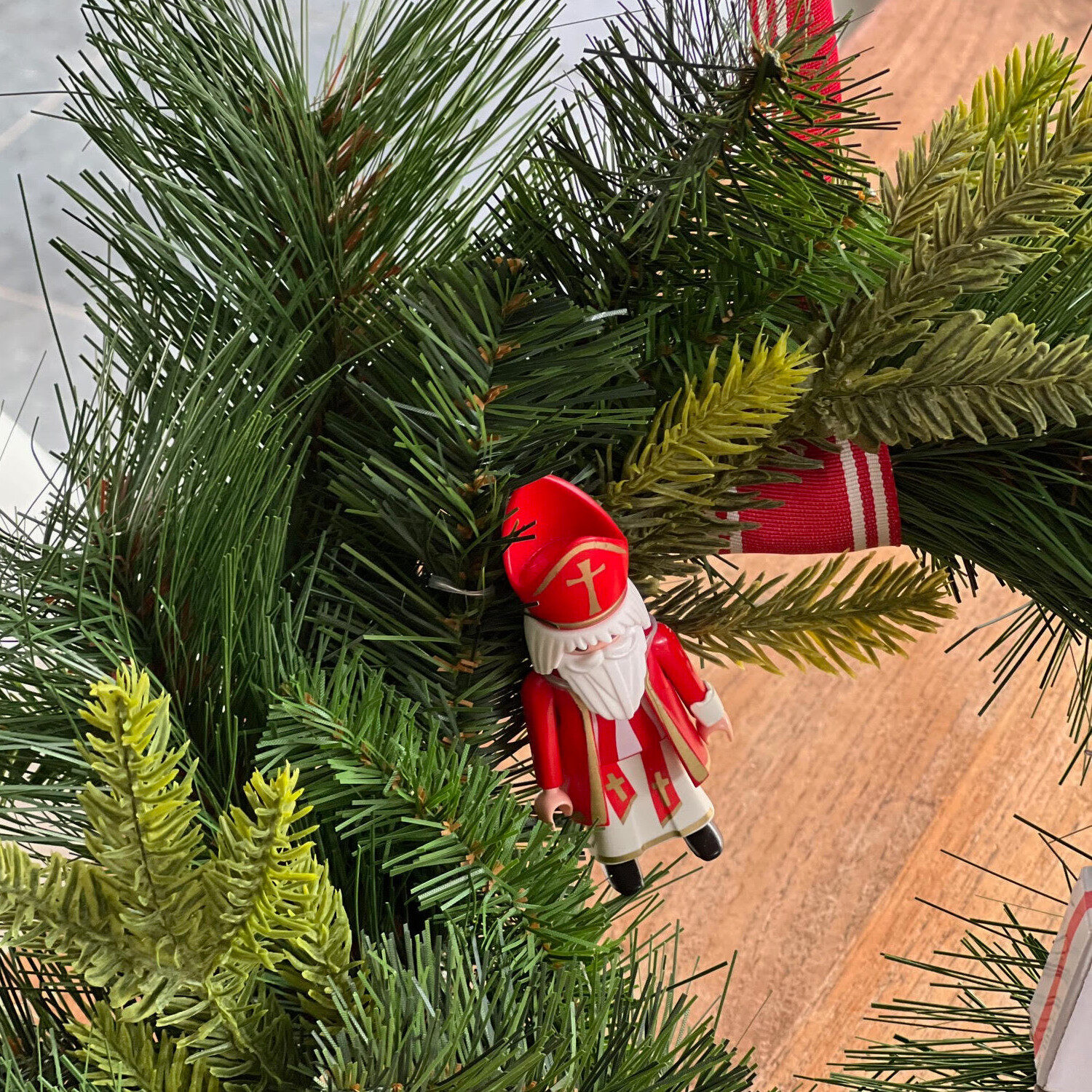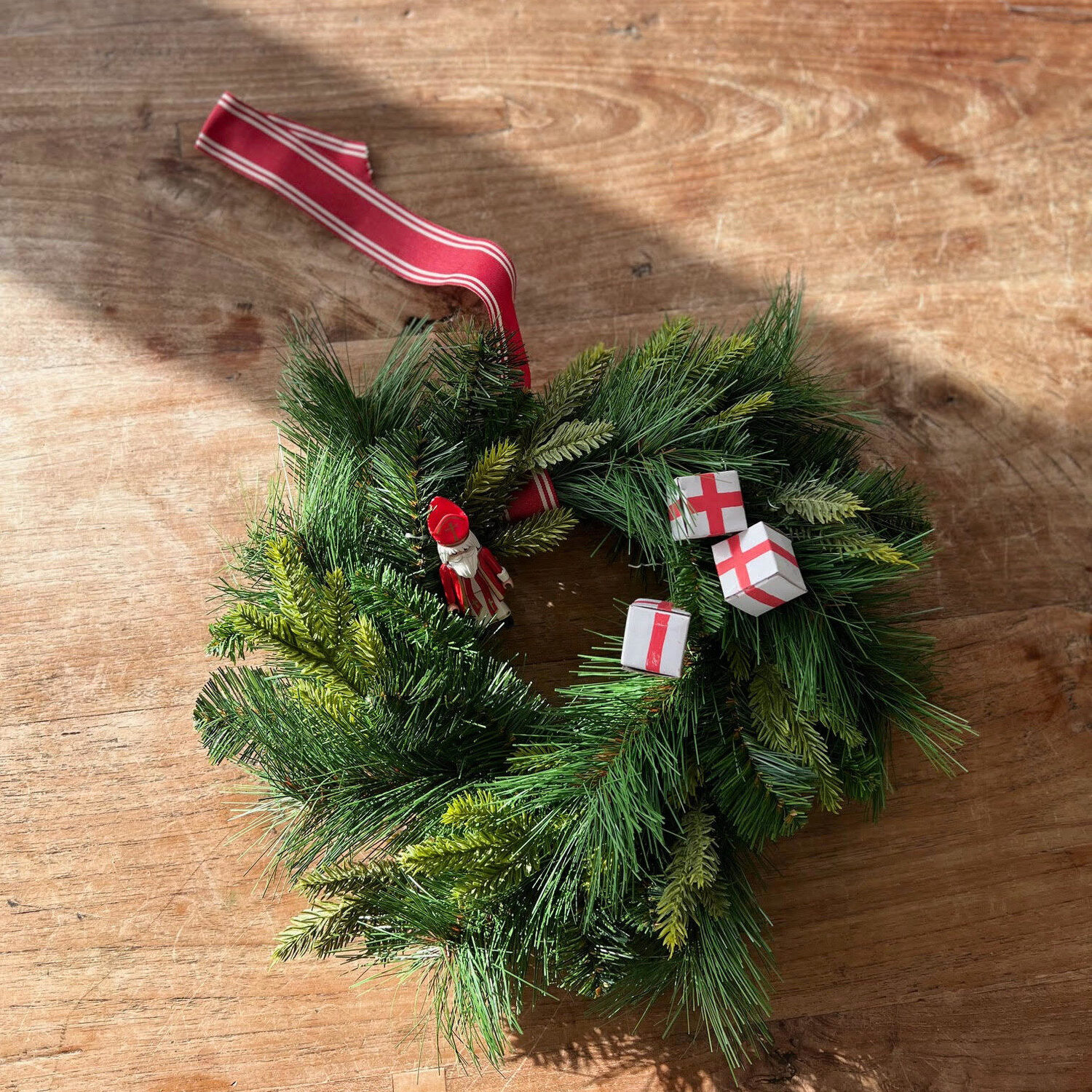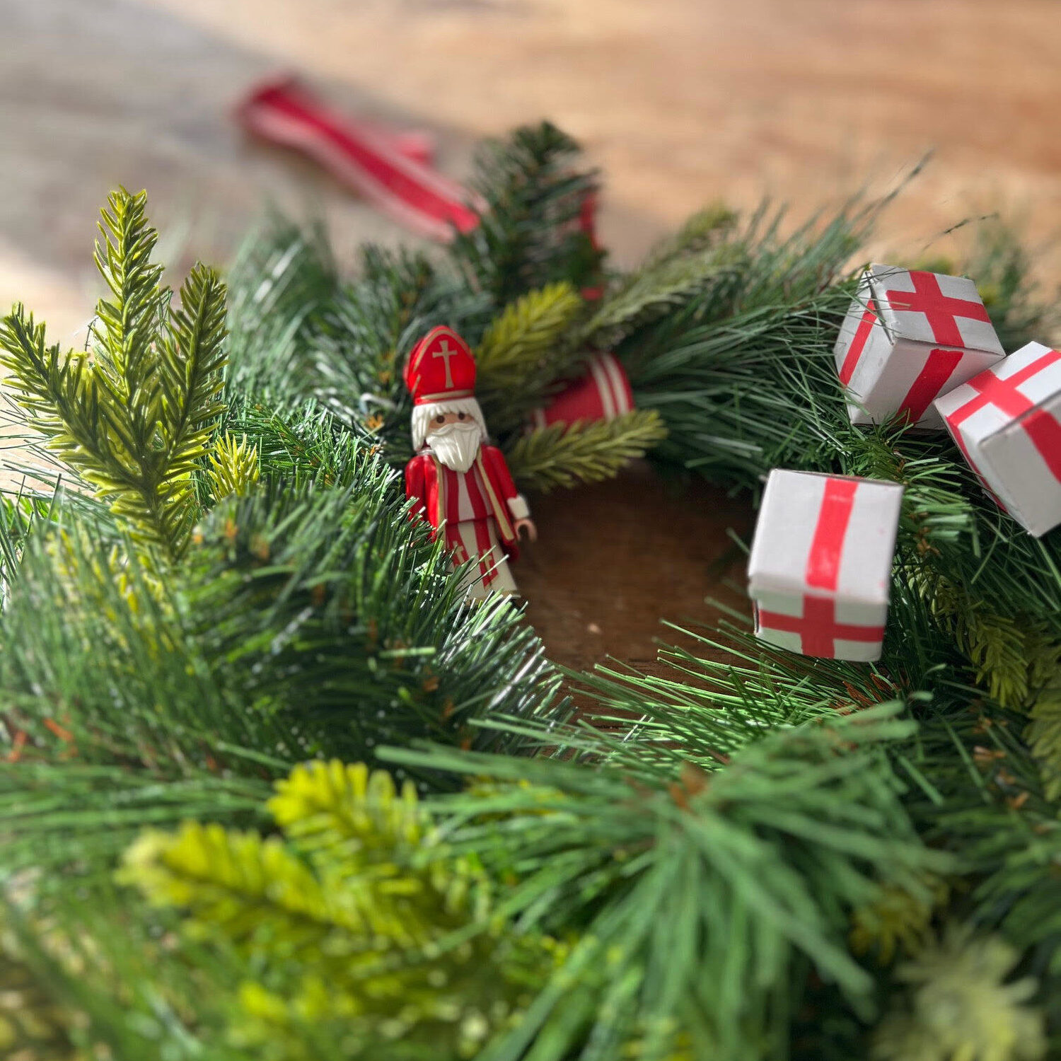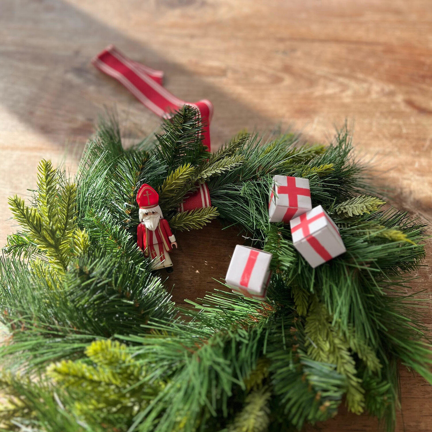 Verzamel een aantal leuke Sinterklaas attributen om in de krans te verwerken. Ik hou van rustig dus kies ik heel bewust alleen voor attributen in de kleuren rood en wit; de kleuren van Sinterklaas en ze kleuren mooi bij het groen van de krans. Als je dat aanhoudt en niet teveel attributen gebruikt, krijg je vanzelf een stijlvolle krans. Ook al gebruik je handgemaakte doosjes zoals ik hier doe :-). Gebruik verder wat ijzerdraad om alles vast te zetten.