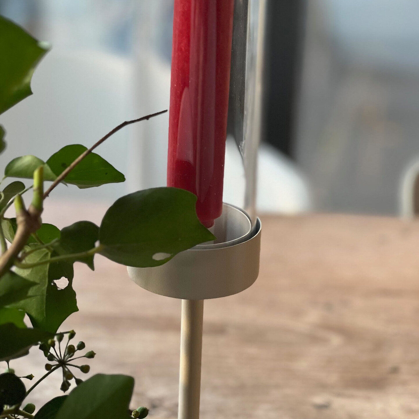 De kaars is ook geschikt voor op de buitentafel. Dankzij de glazen koker blijft de lont branden, zelfs in de wind.