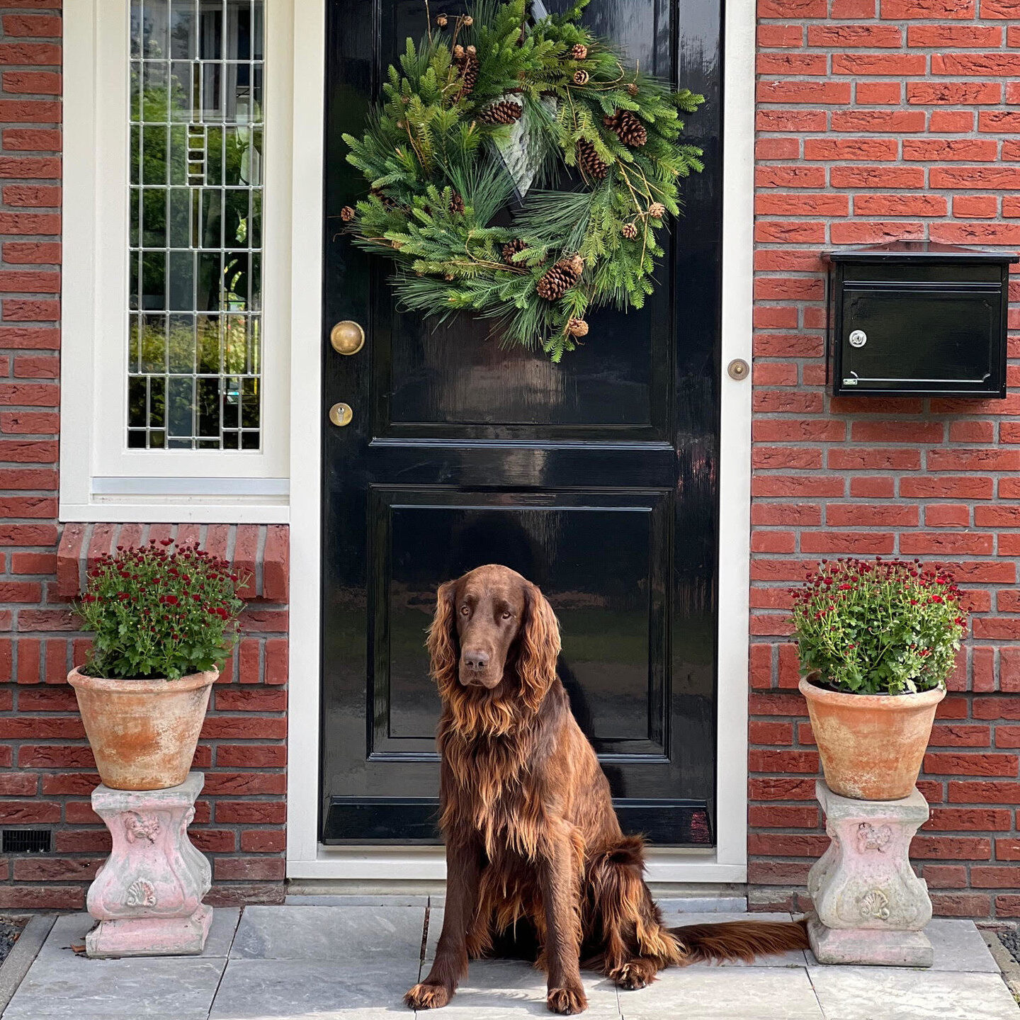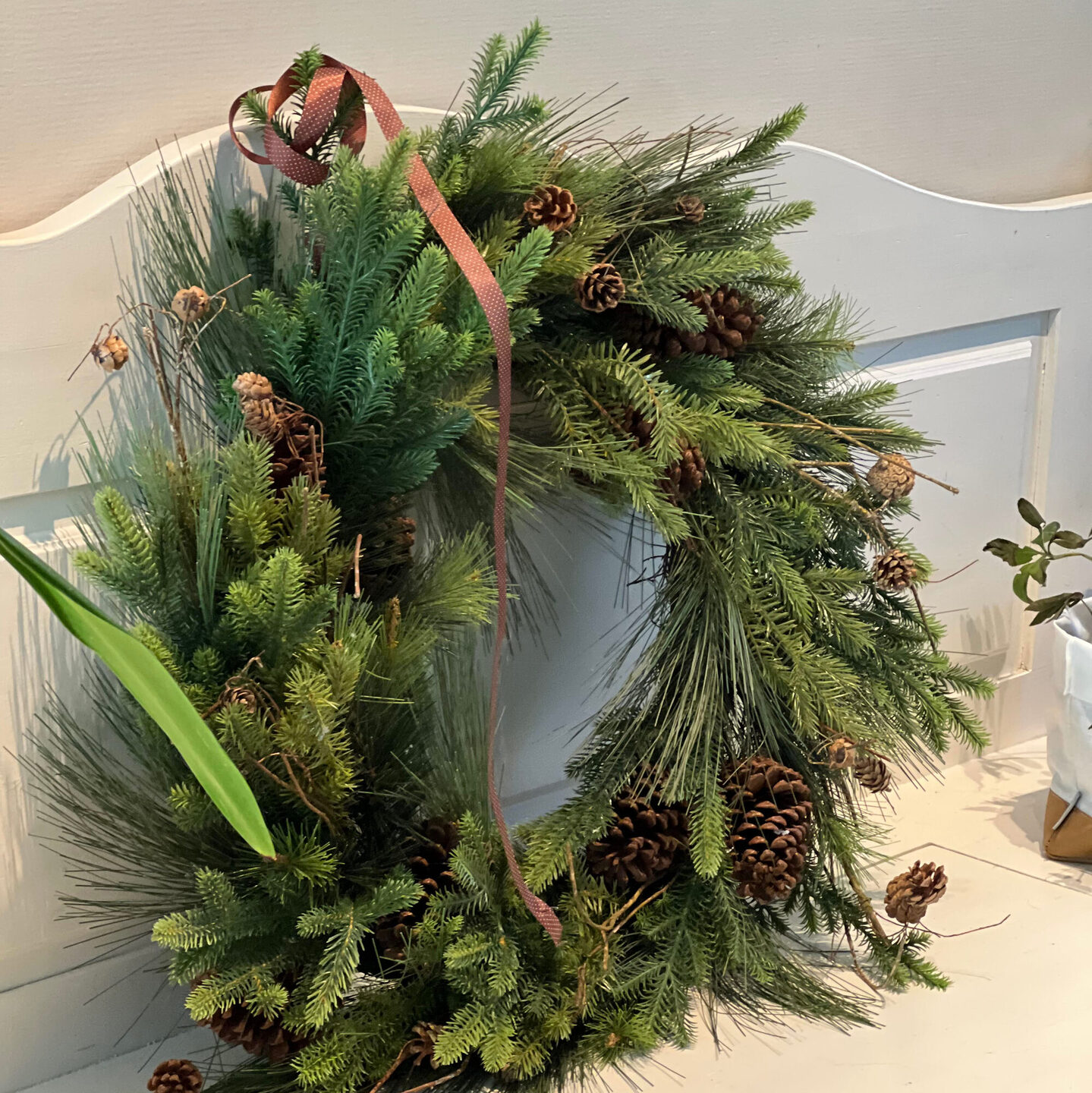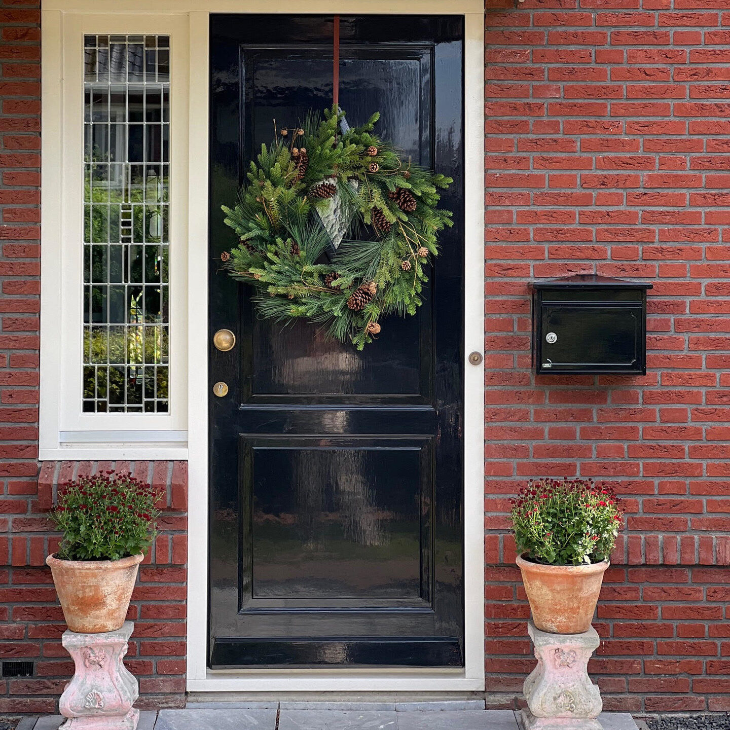 De krans is gemaakt van kunstplanten en kan elk jaar opnieuw gebruikt worden. Bij aanvang van de herfst kun je de krans extra versieren met paddenstoelen en/of andere herfstattributen. Met kerst kun je de krans dan weer aanpassen. Maar gewoon clean is hij ook super mooi en rustig.
