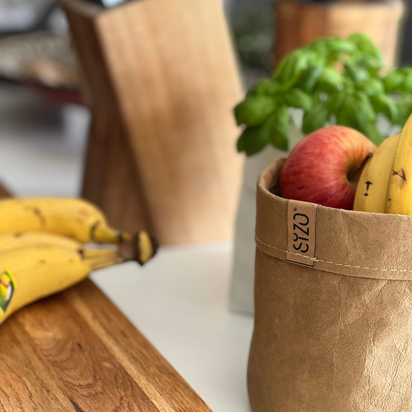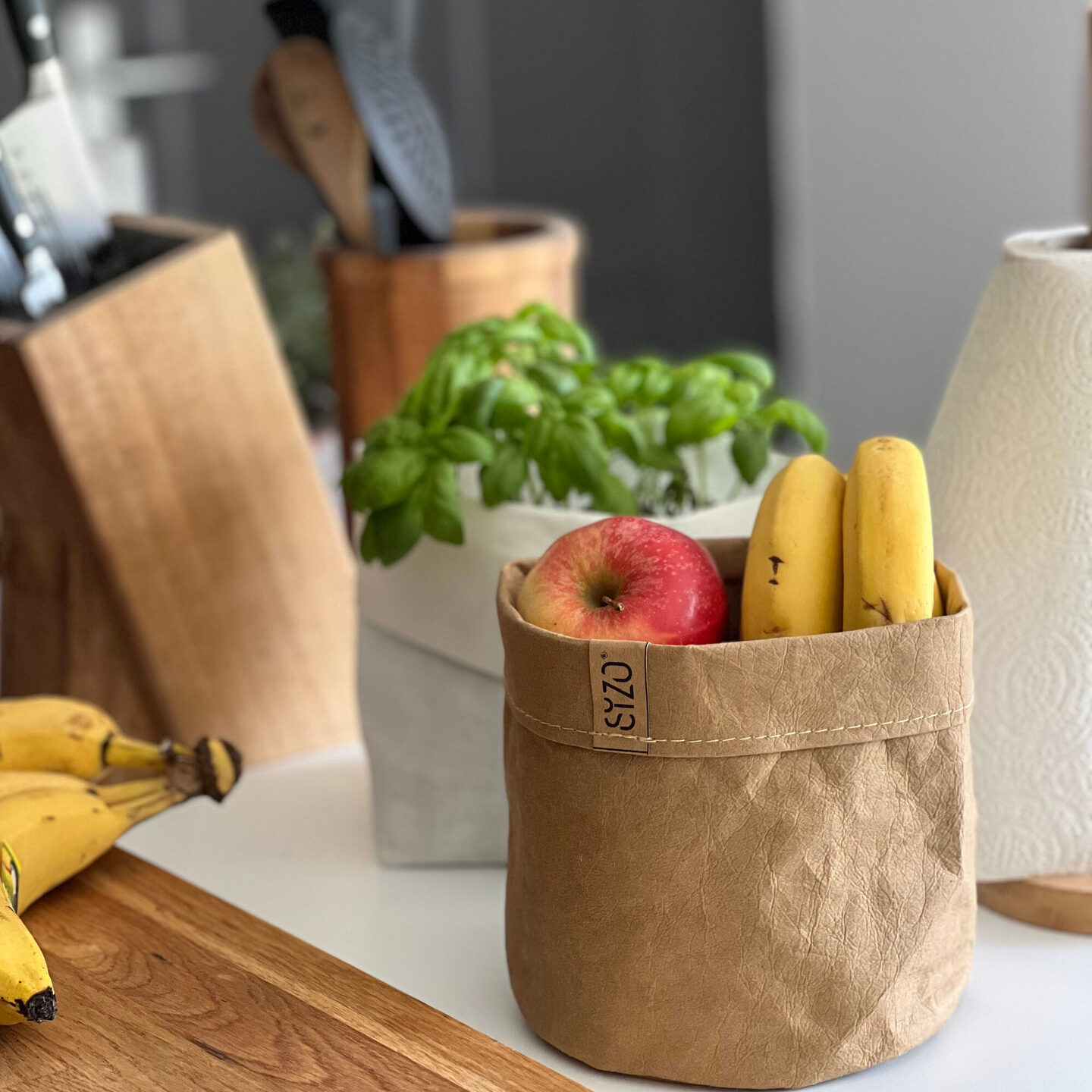 De SIZO Paper Bag is verkrijgbaar in verschillende maten en heeft een biologisch afbreekbare waterdichte voering om het druppelen van water te voorkomen. Deze tas kan in de wasmachine op 30 graden worden gewassen.