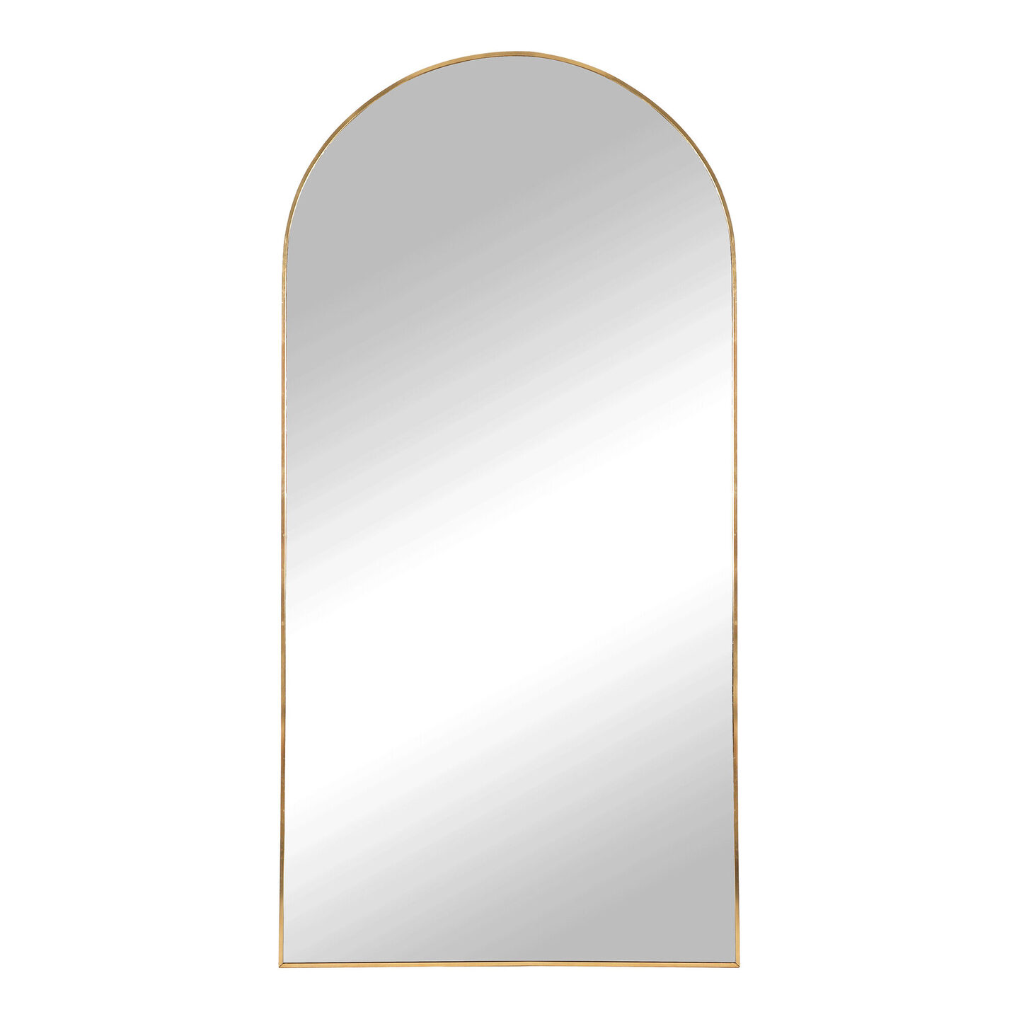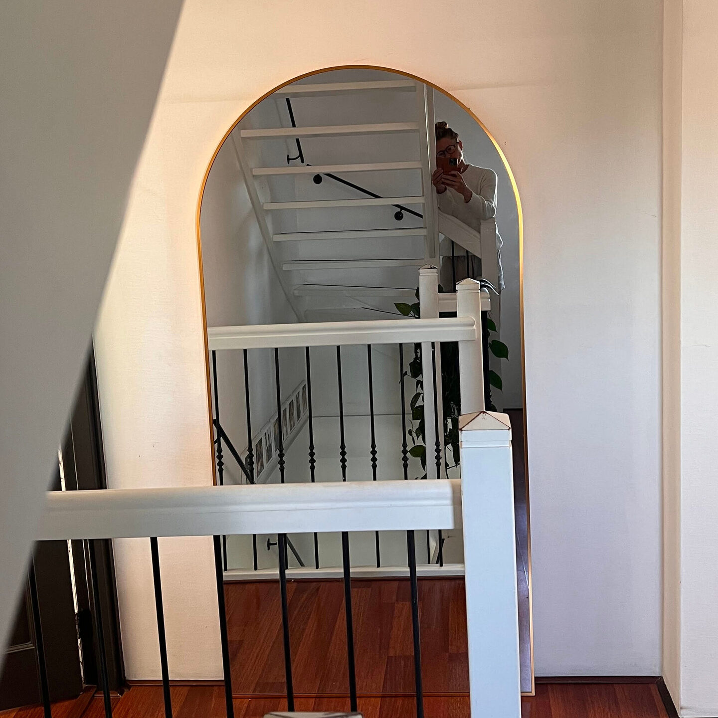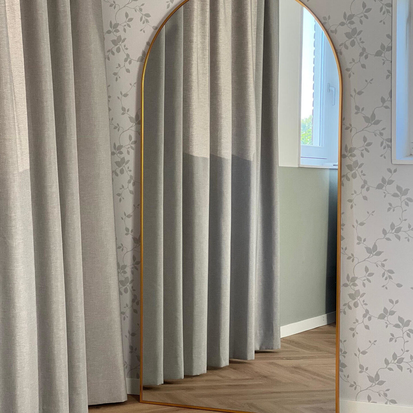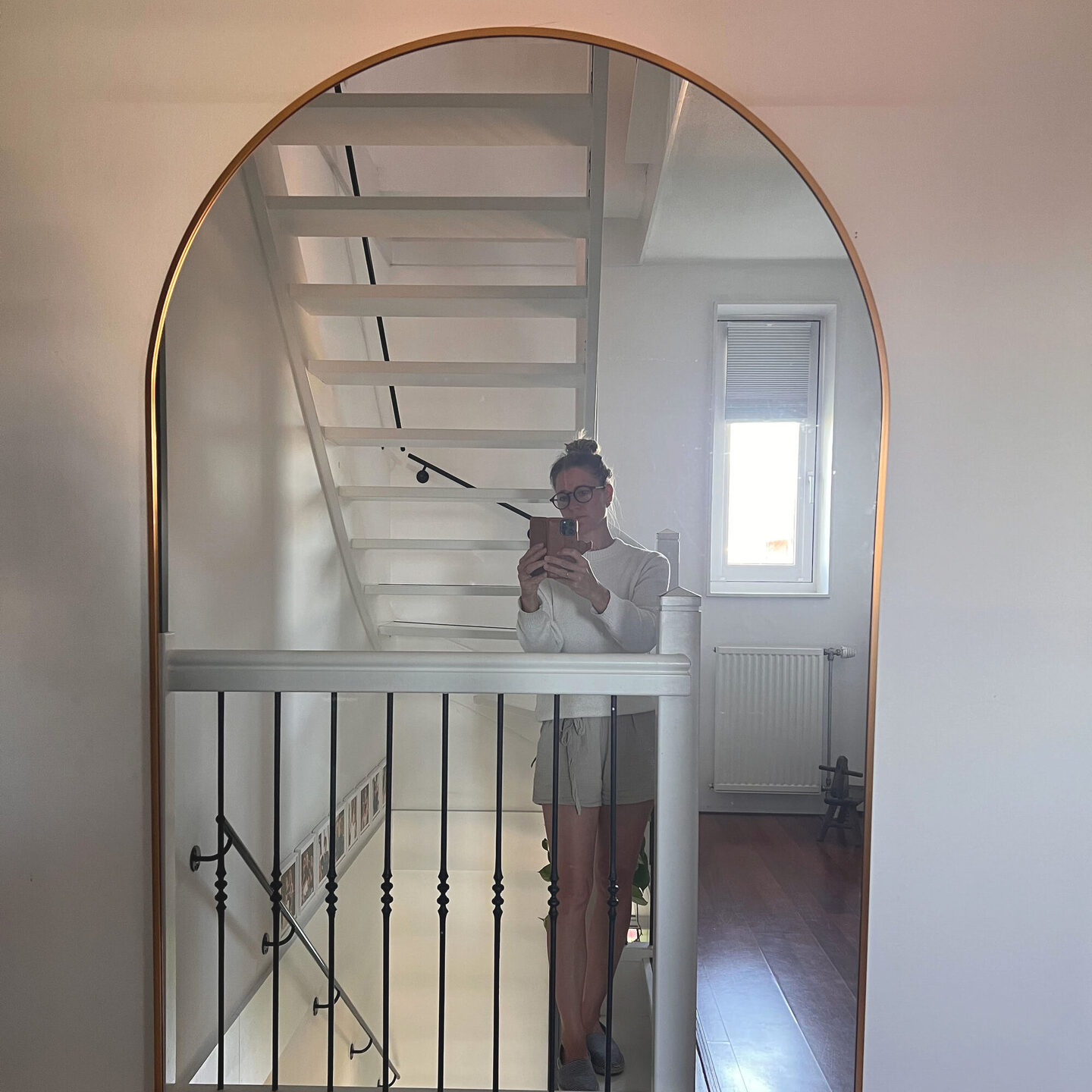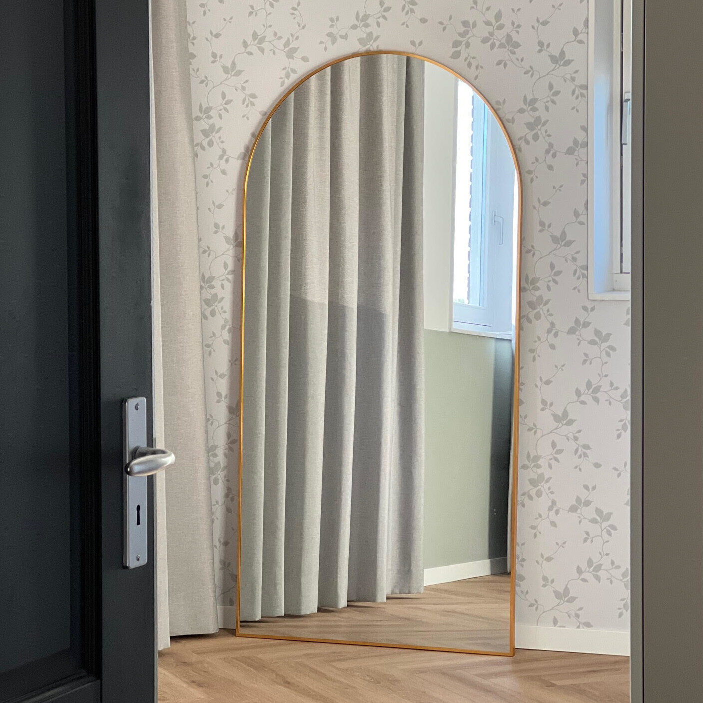 Deze stijlvolle spiegel combineert een modern ontwerp met praktische functionaliteit. De grootte van de volledige lengte biedt een compleet zicht, terwijl het koperen frame een vleugje warmte en elegantie toevoegt. De gebogen top maakt de spiegel extra stijlvol. Hij staat bij ons in de kleedruimte waar ik hem ook gebruik voor bij mijn yoga oefeningen. De spiegel arriveert volledig gemonteerd.